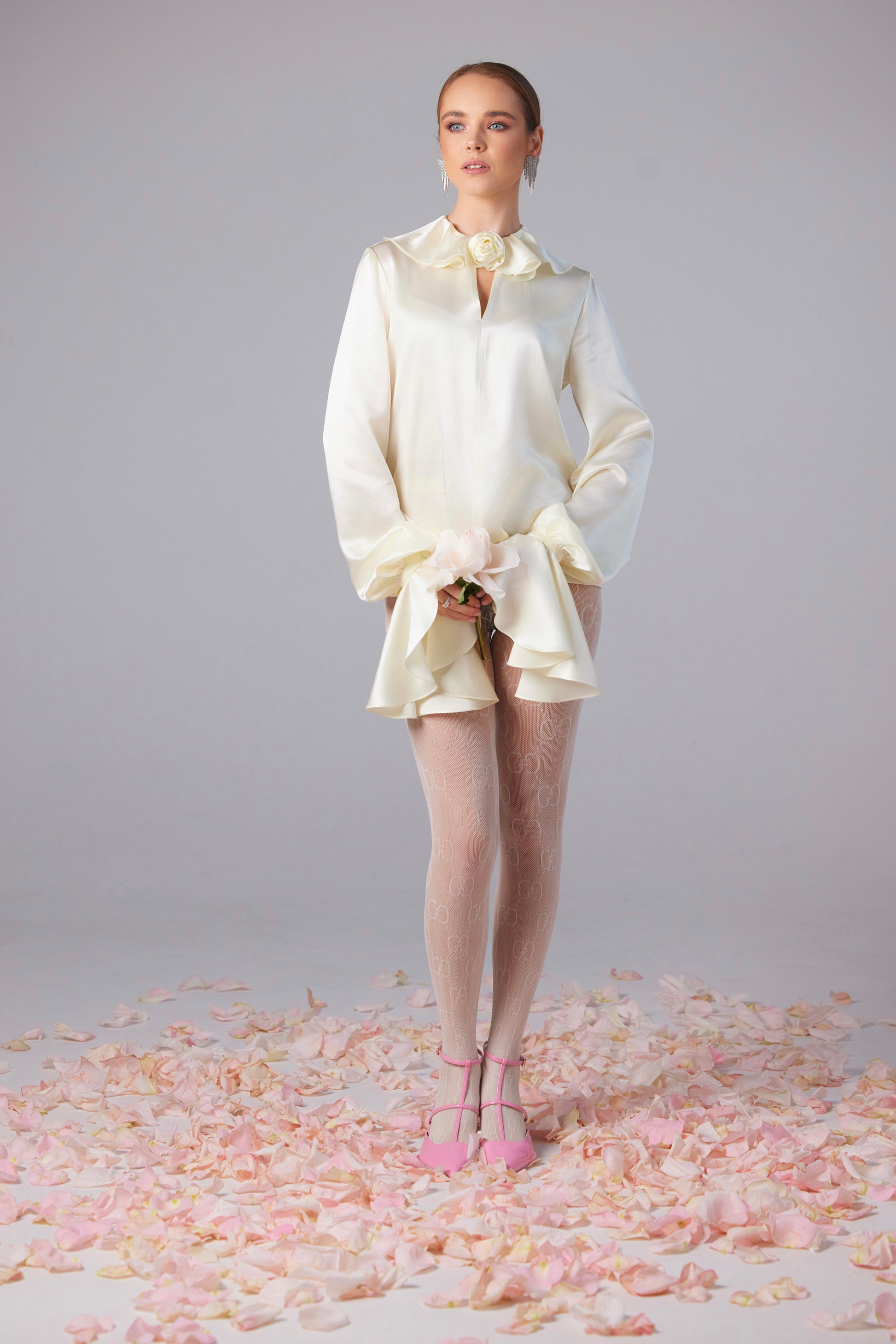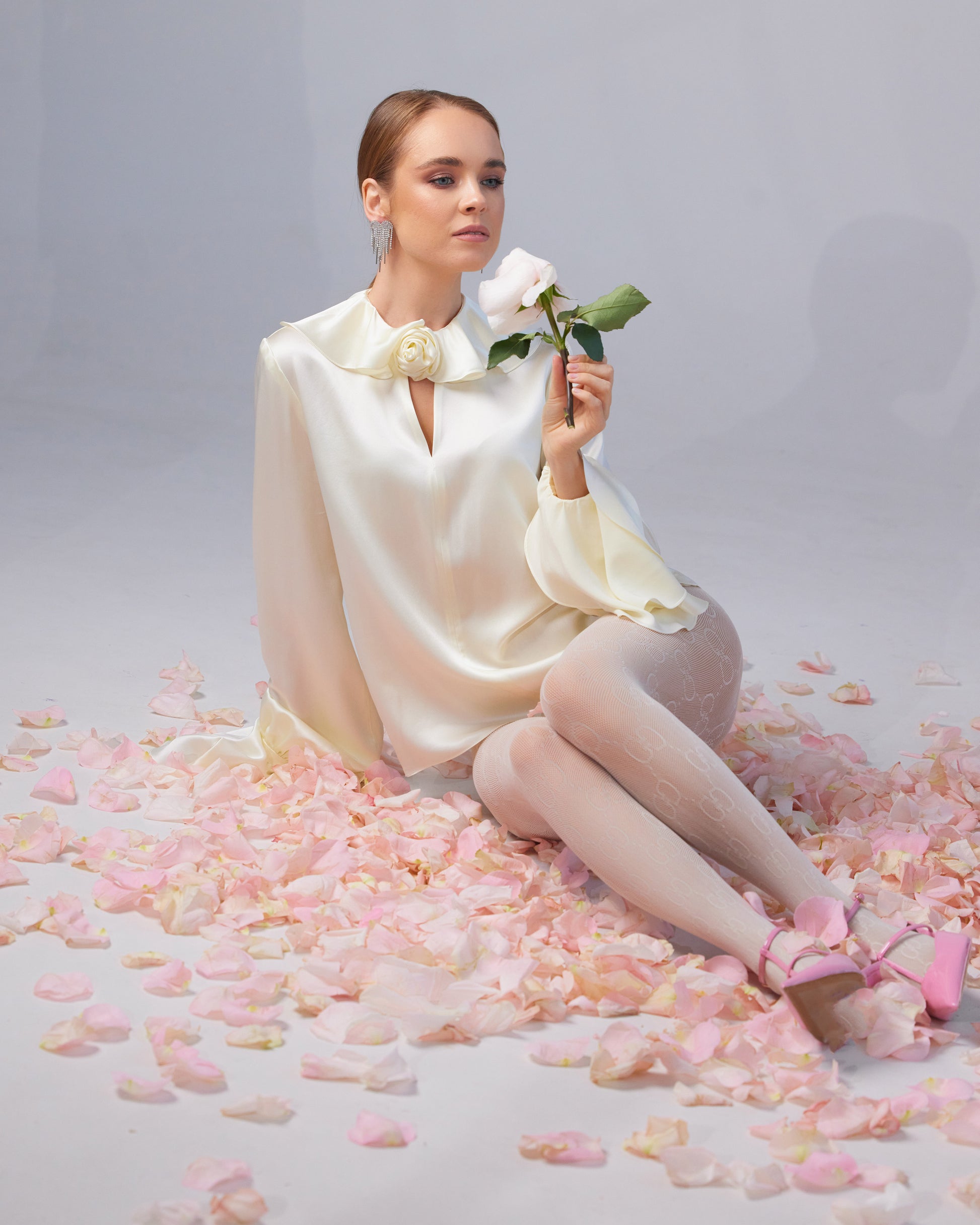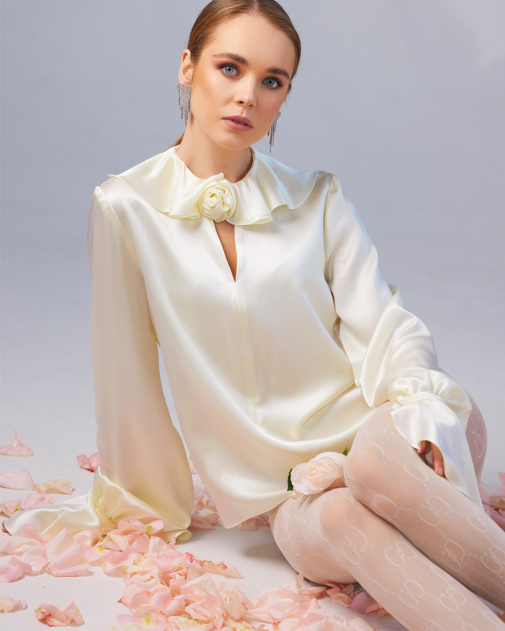 Made of lustrous ivory silk, the Marie-Antoinette blouse has a classic, slightly loose silhouette, detailed with extravagant ruffle sleeves and rose choker. Style yours with pearl earrings, classy bottoms and a pair of Mary-Janes.