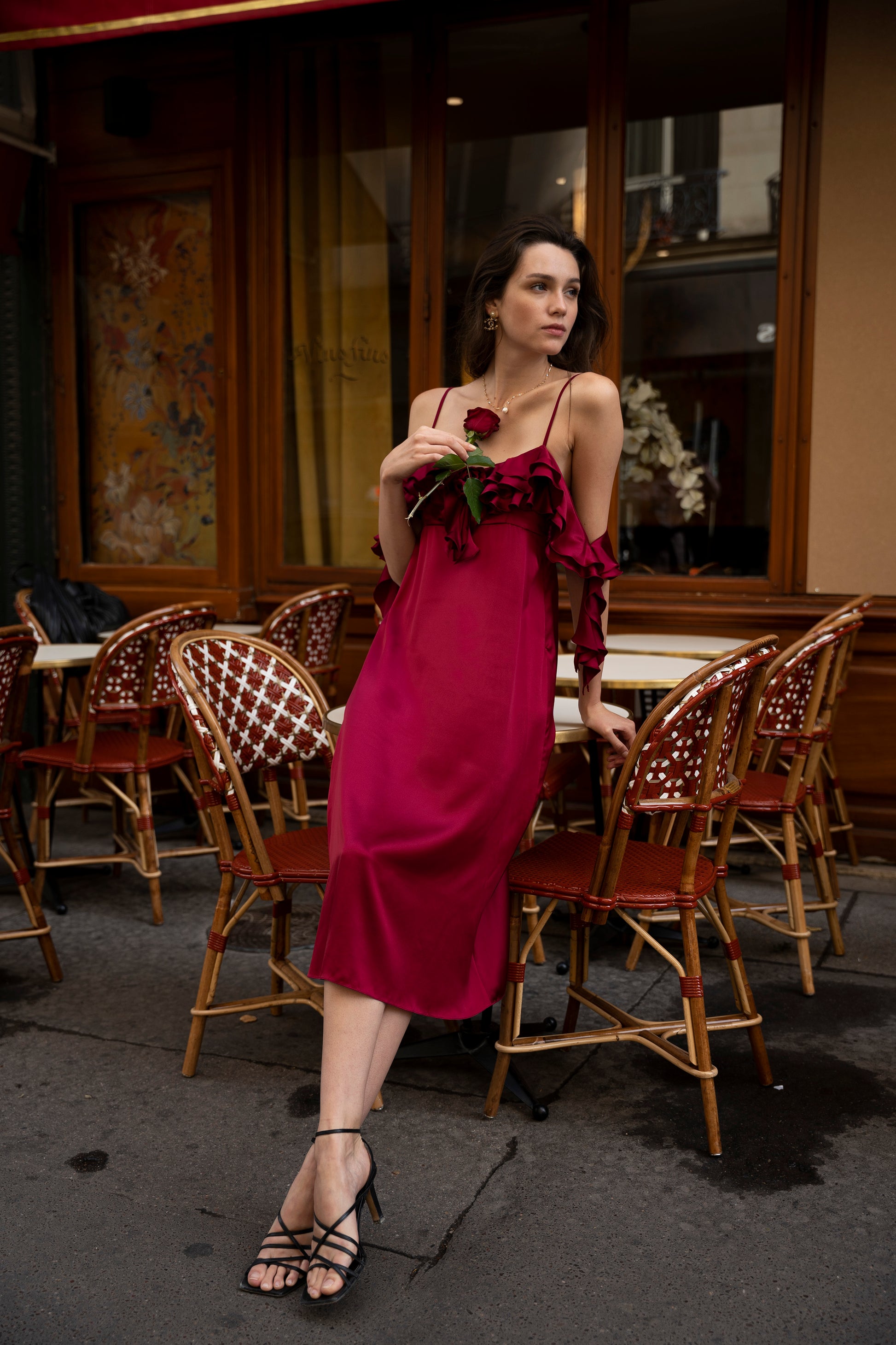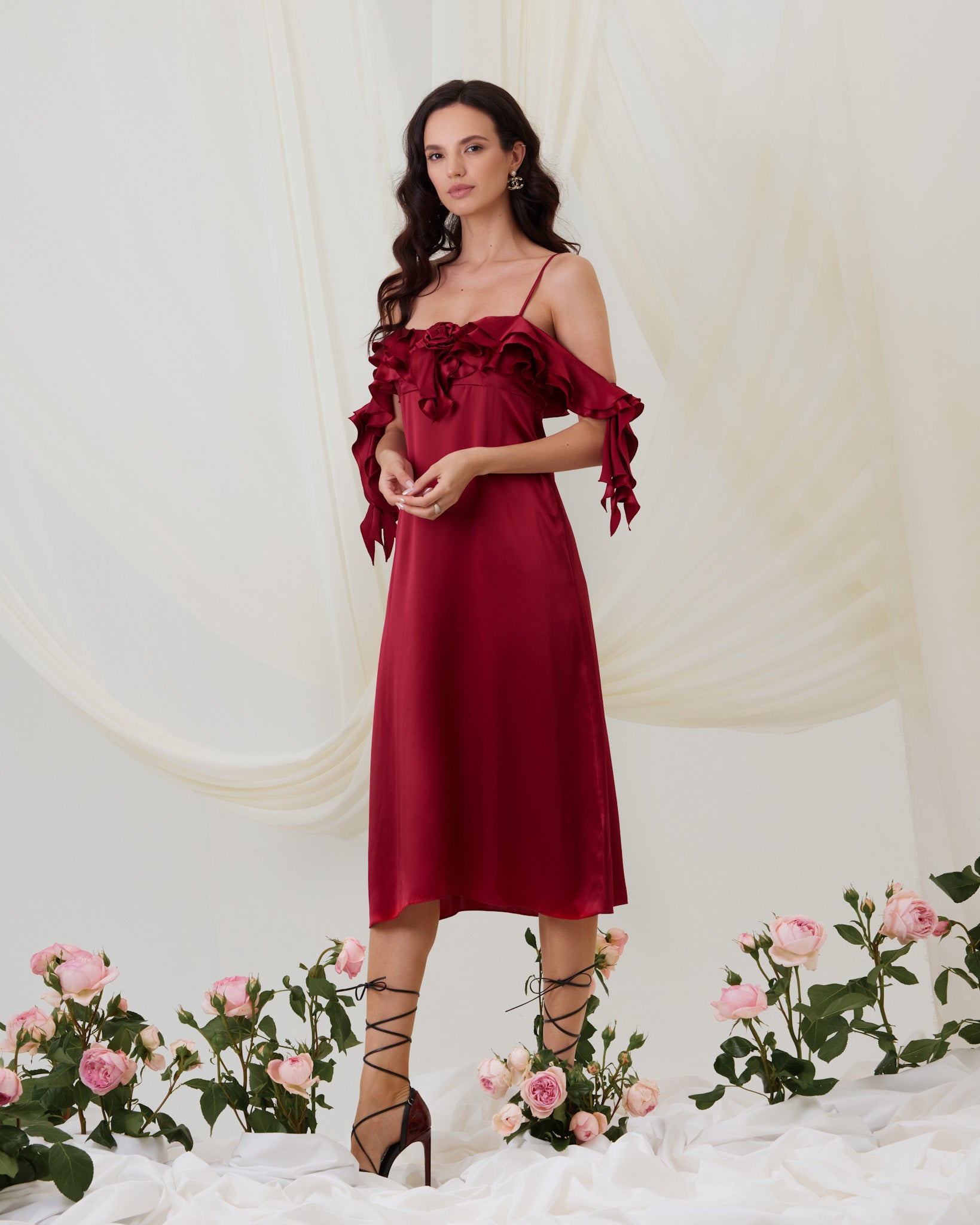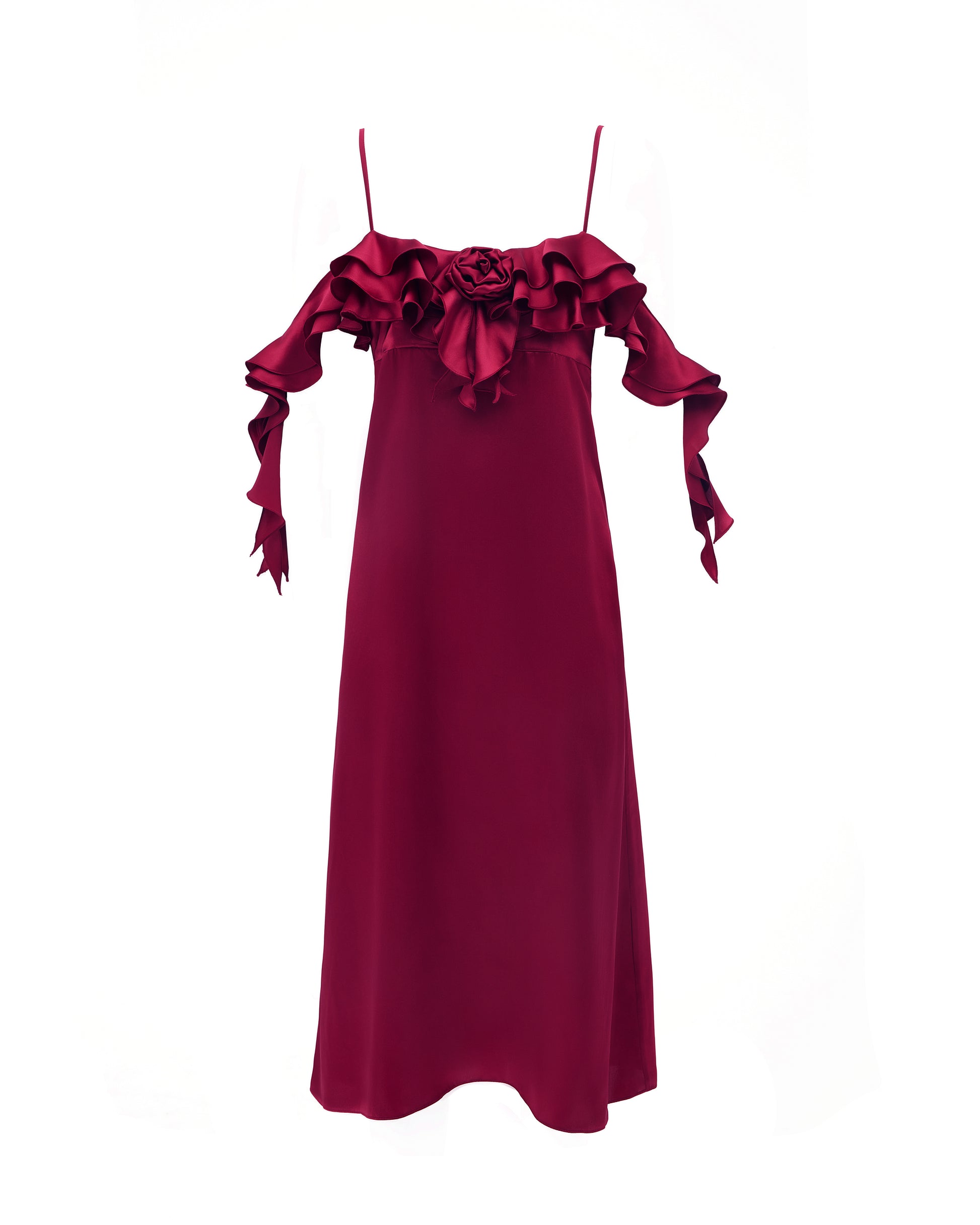 Rosie ruffle midi dress is the true definition of romance with its vibrant burgundy hue and delicate shoulder ruffle details. The flowing design is embellished with a small rose pin for an extra touch of sophistication. The sleeves falling off the shoulders are also imitating the rose petals with its soft folds, emerging you into the world of mystery and soft glamour.
