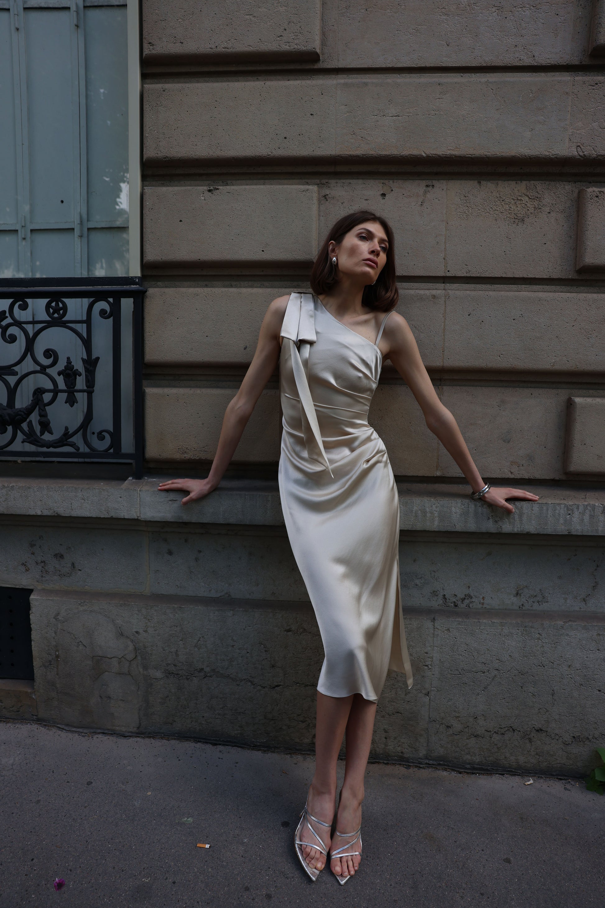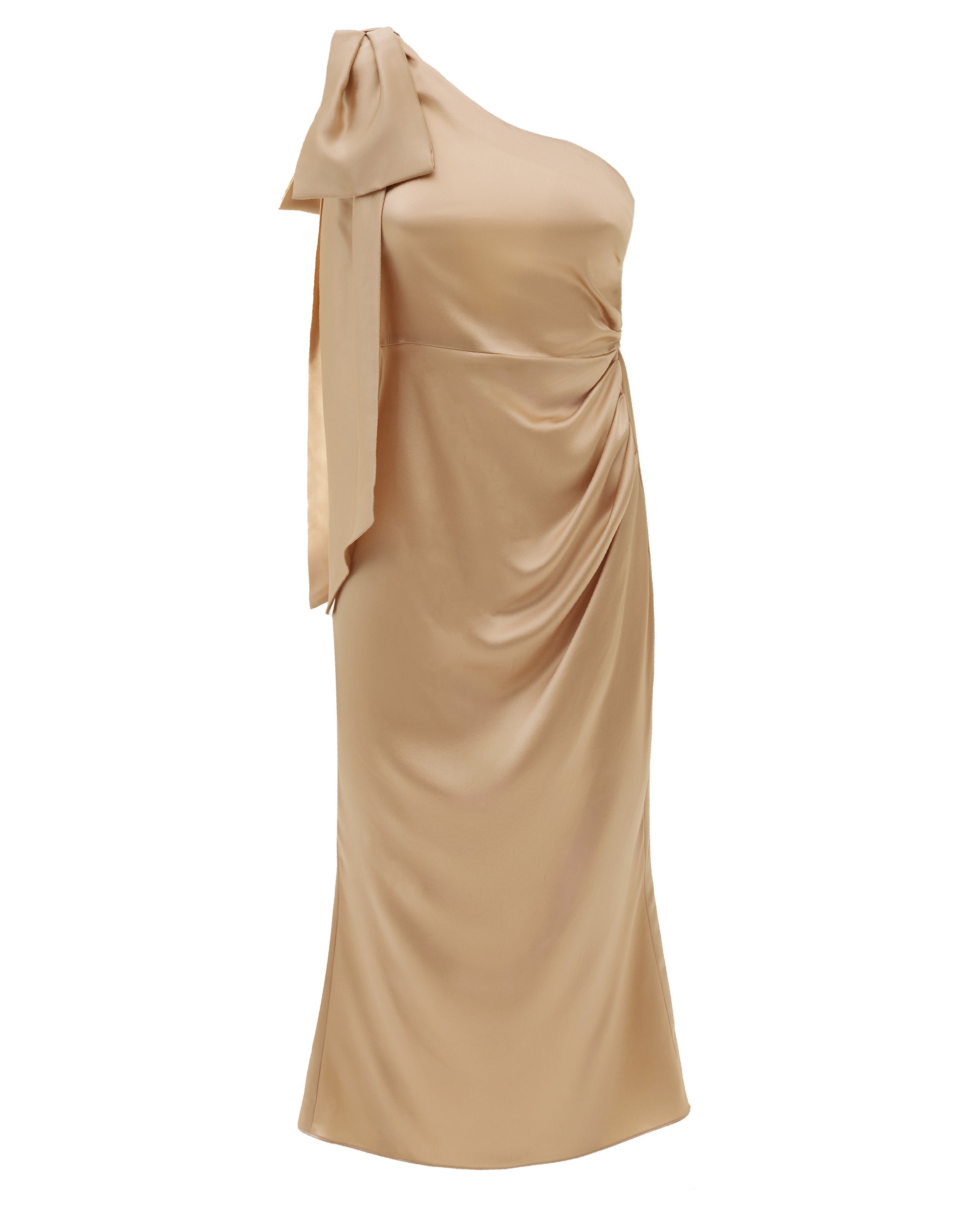 Crafted from a lustrous honey hued pure silk satin, this dress presents a look of elegance. An oversized bow detail enhances its asymmetric neckline, continued by an elegant skirt with side draping, completing its sophisticated silhouette. We recommend styling this dress with an updo, accessorising it with golden earrings and a statement clutch.