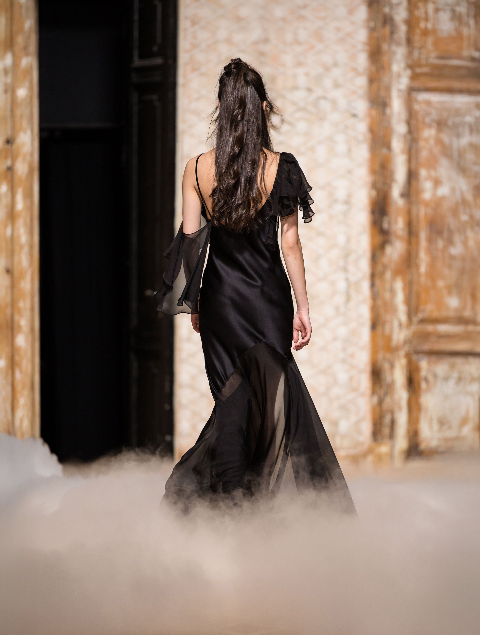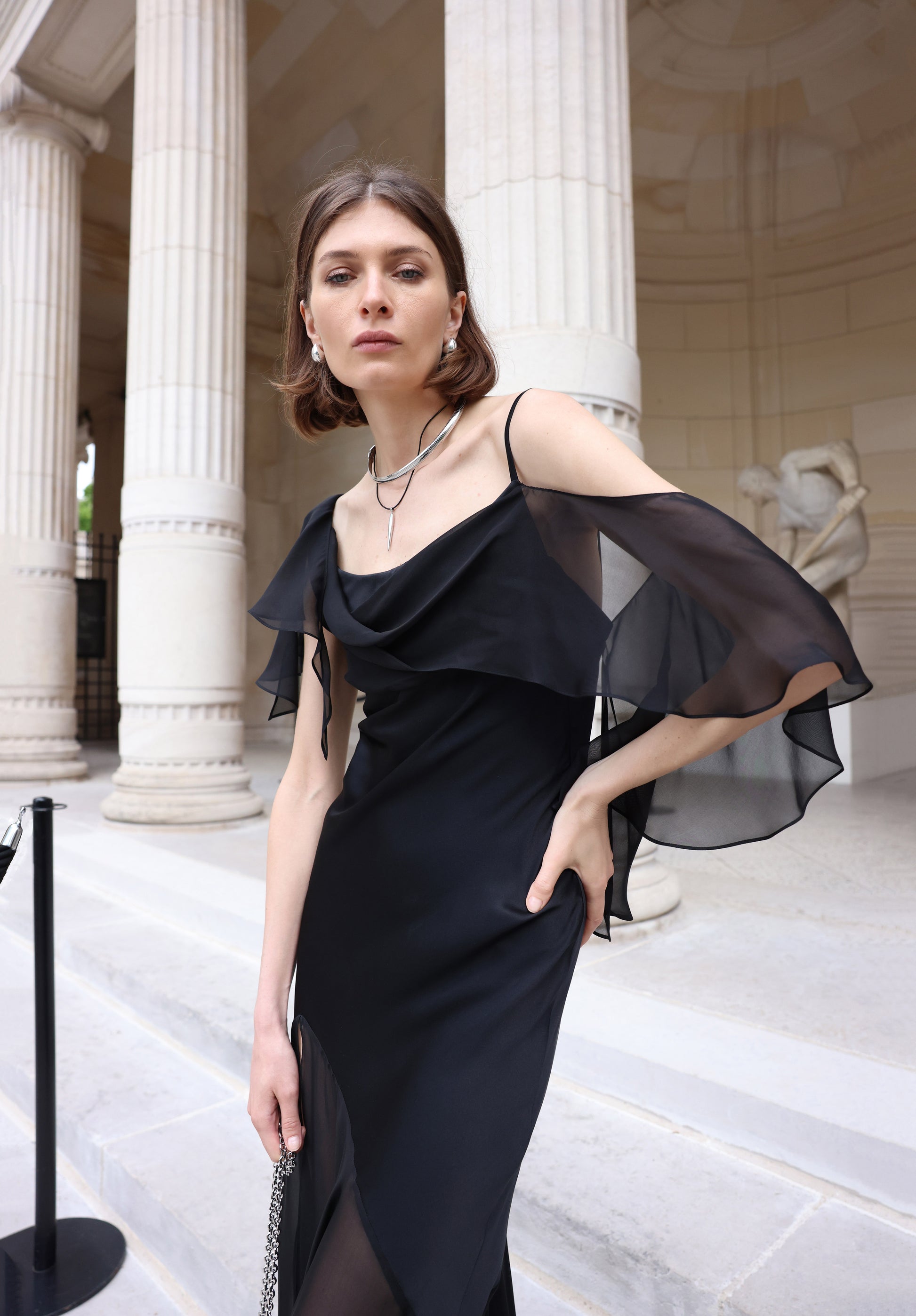 The Vivienne gown design is seductive, yet sophisticated and elegant. Cut from lustrous 100% silk, this bias-cut maxi dress has a body-skimming silhouette, and is defined by an asymmetric neckline, ruffles and a daring leg slit. We recommend to style it with high heels and silver accessories for a chic evening.