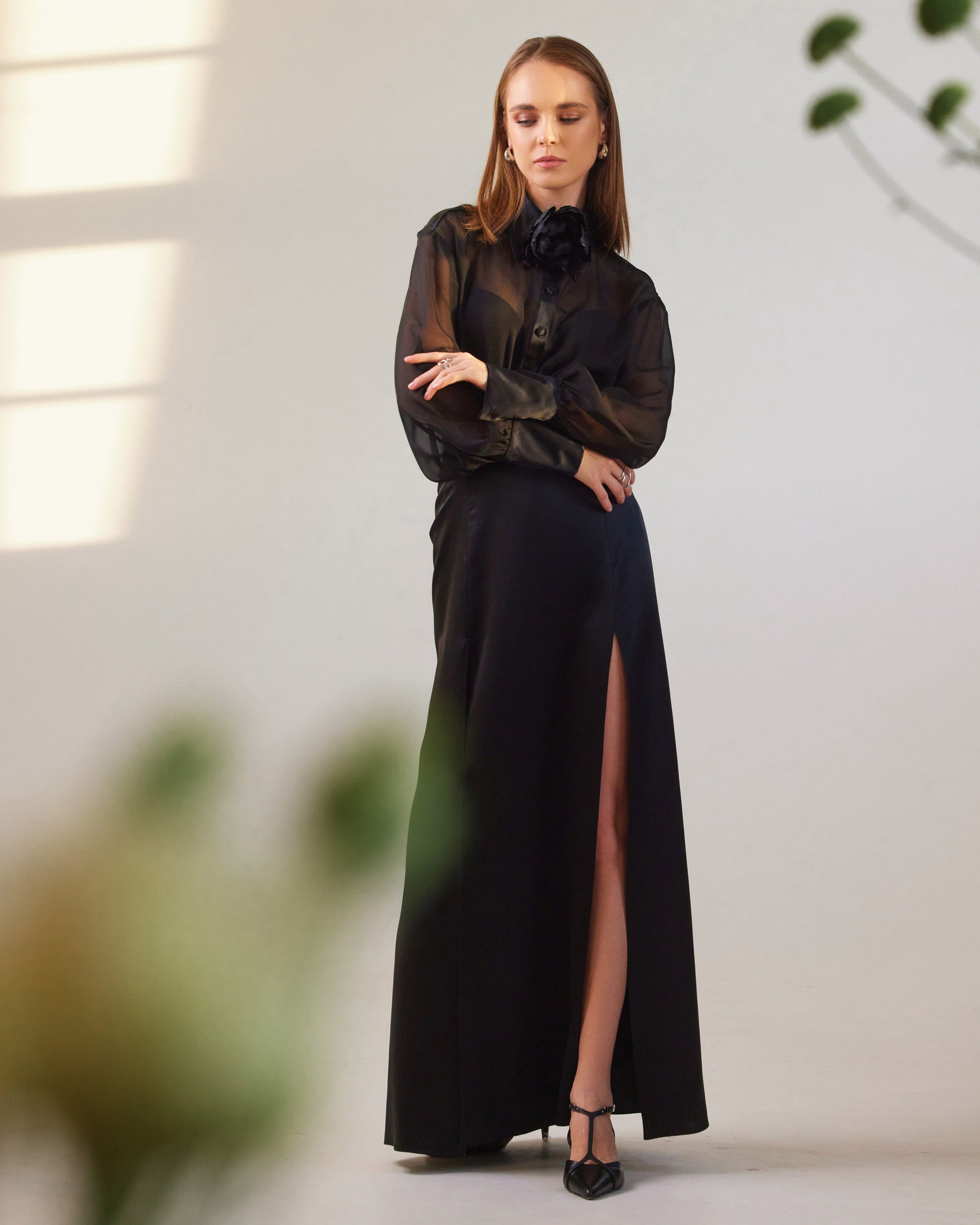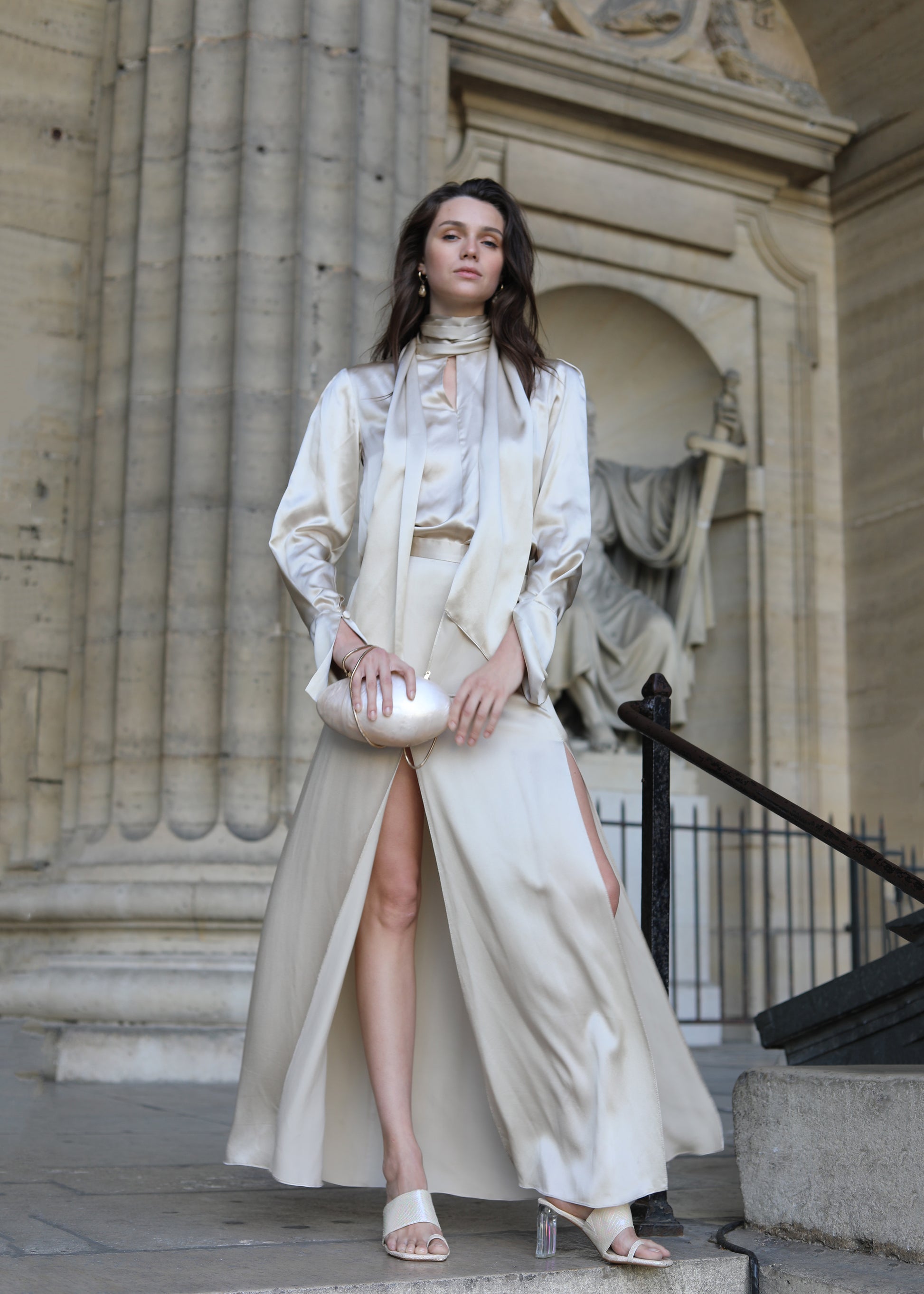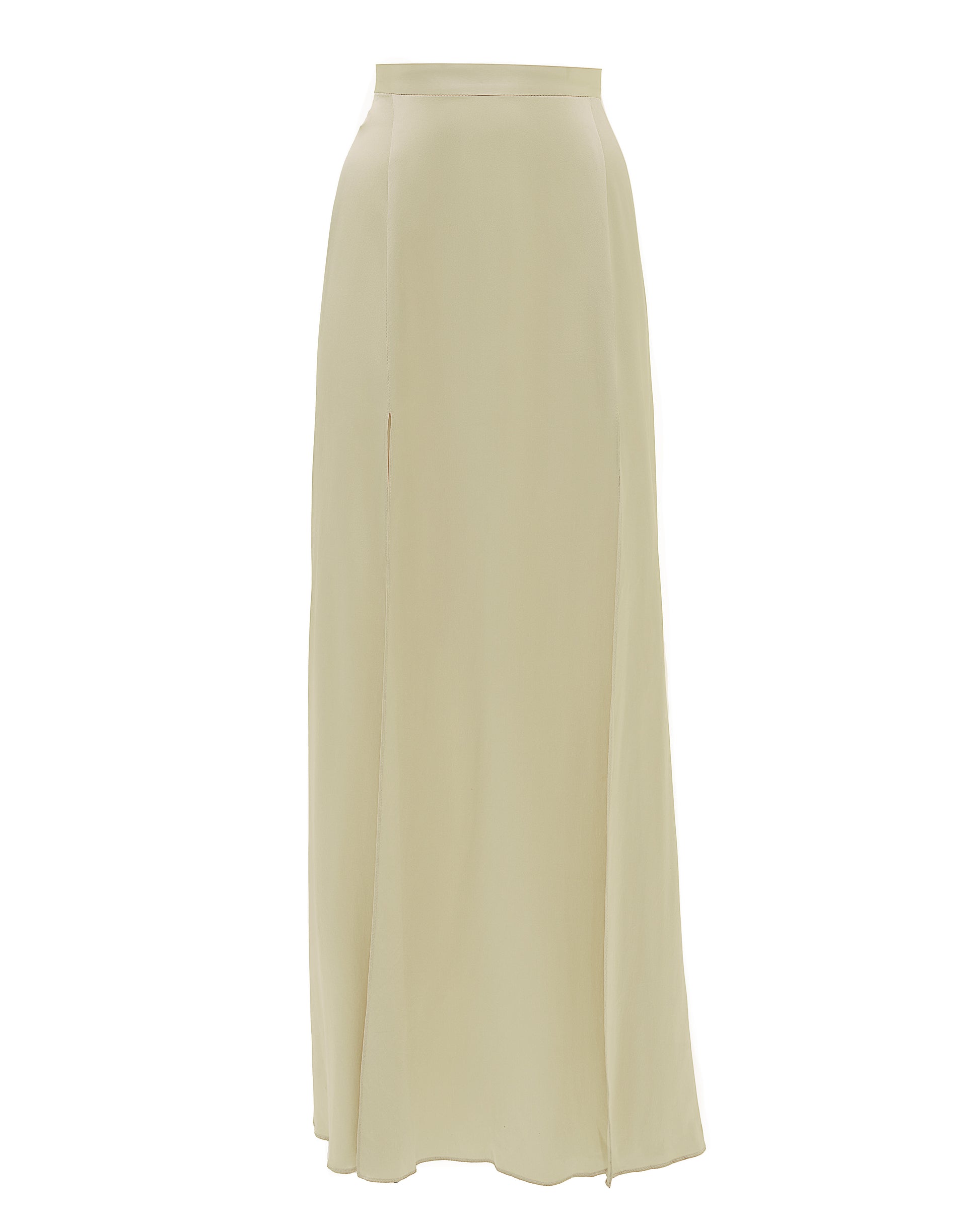This beautifully crafted silk skirt will definately stand the test of time in your wardrobe. The silhouette of the Camille maxi skirt is truly embracing the allure of '90s minimalism. It's shaped to a dramatic, floor-grazing length with high slits and can be perfectly matched with Camille blouse for an exceptional pearlescent, monochrome look.