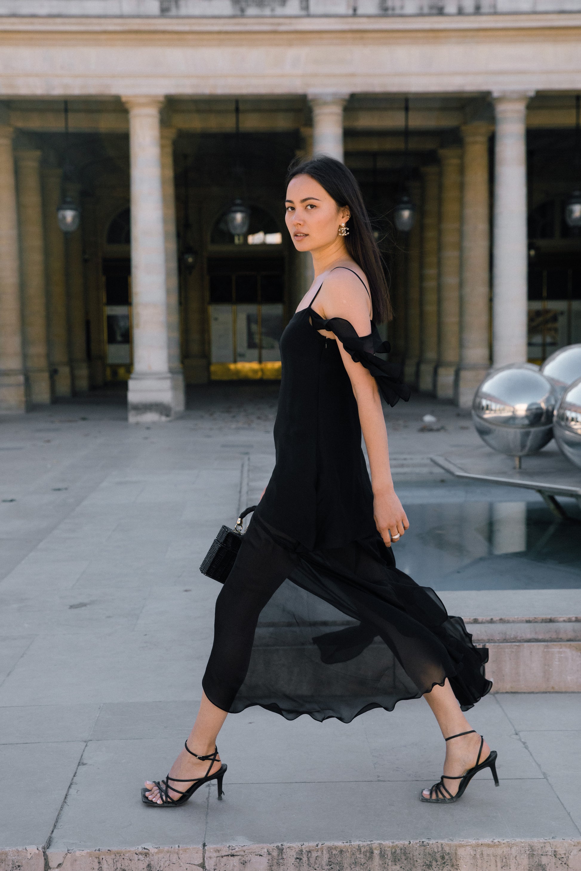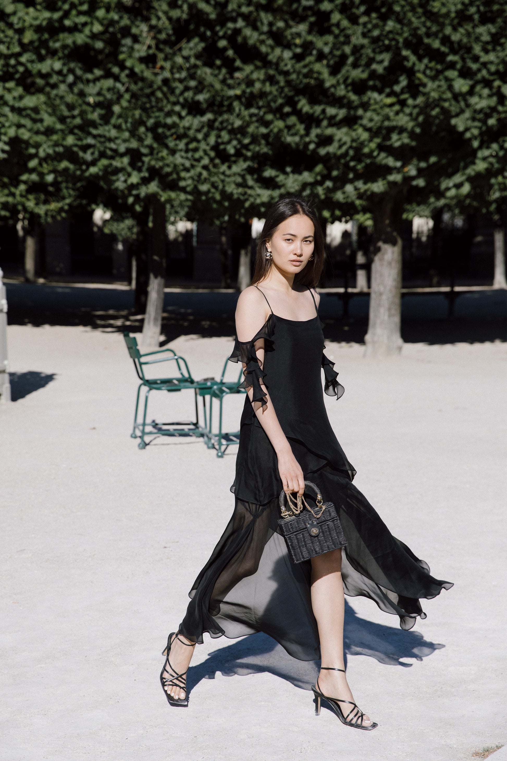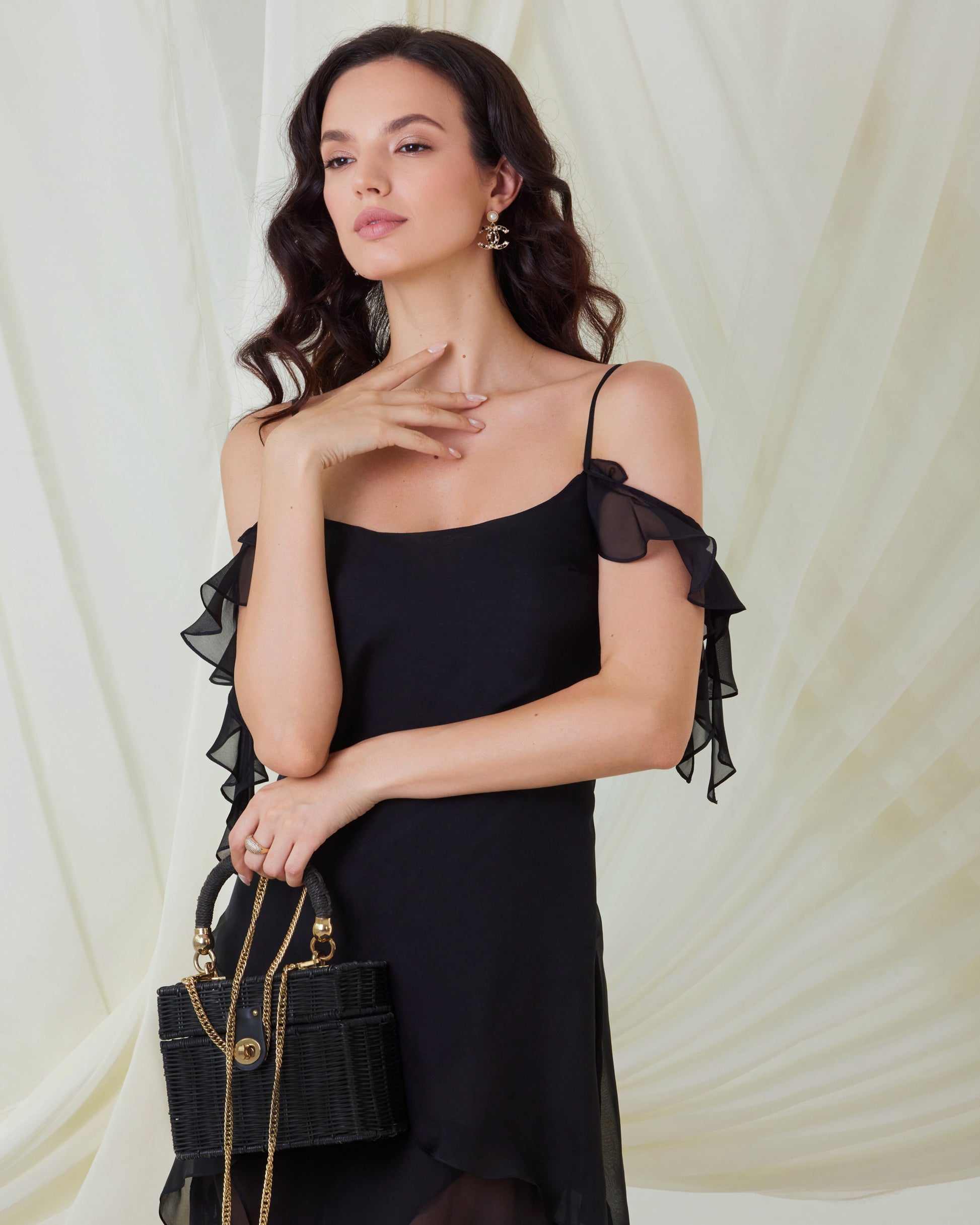 Catarina's dress sultry design is cut from the finest silk chiffon and features several layers to add coverage where it's needed. Lightweight chiffon is beautifully draped on the sides, falling to a high-low hem, moving beautifully as you walk. The sleeves are repeating the soft folds falling off the shoulders for an added romance.