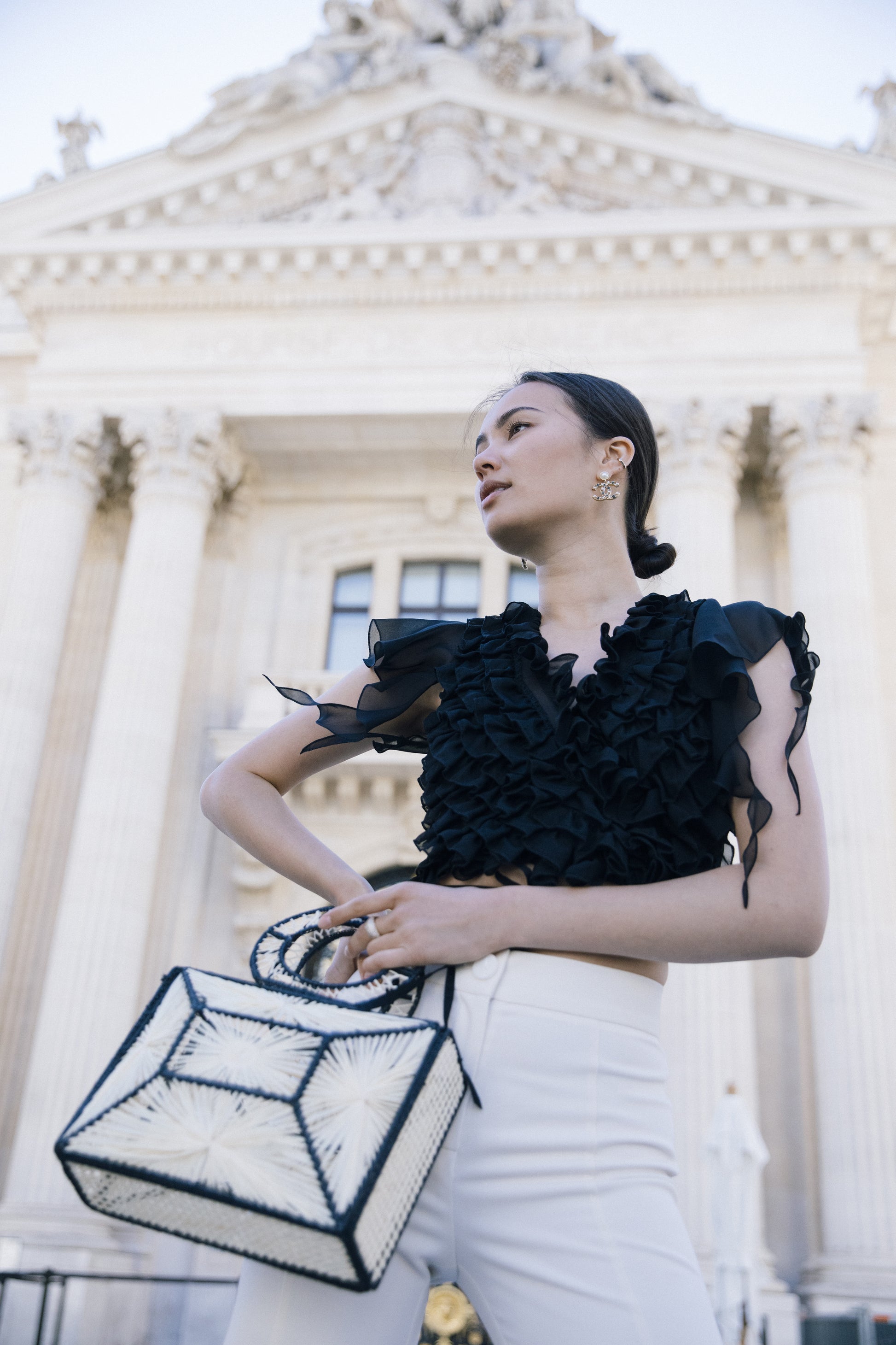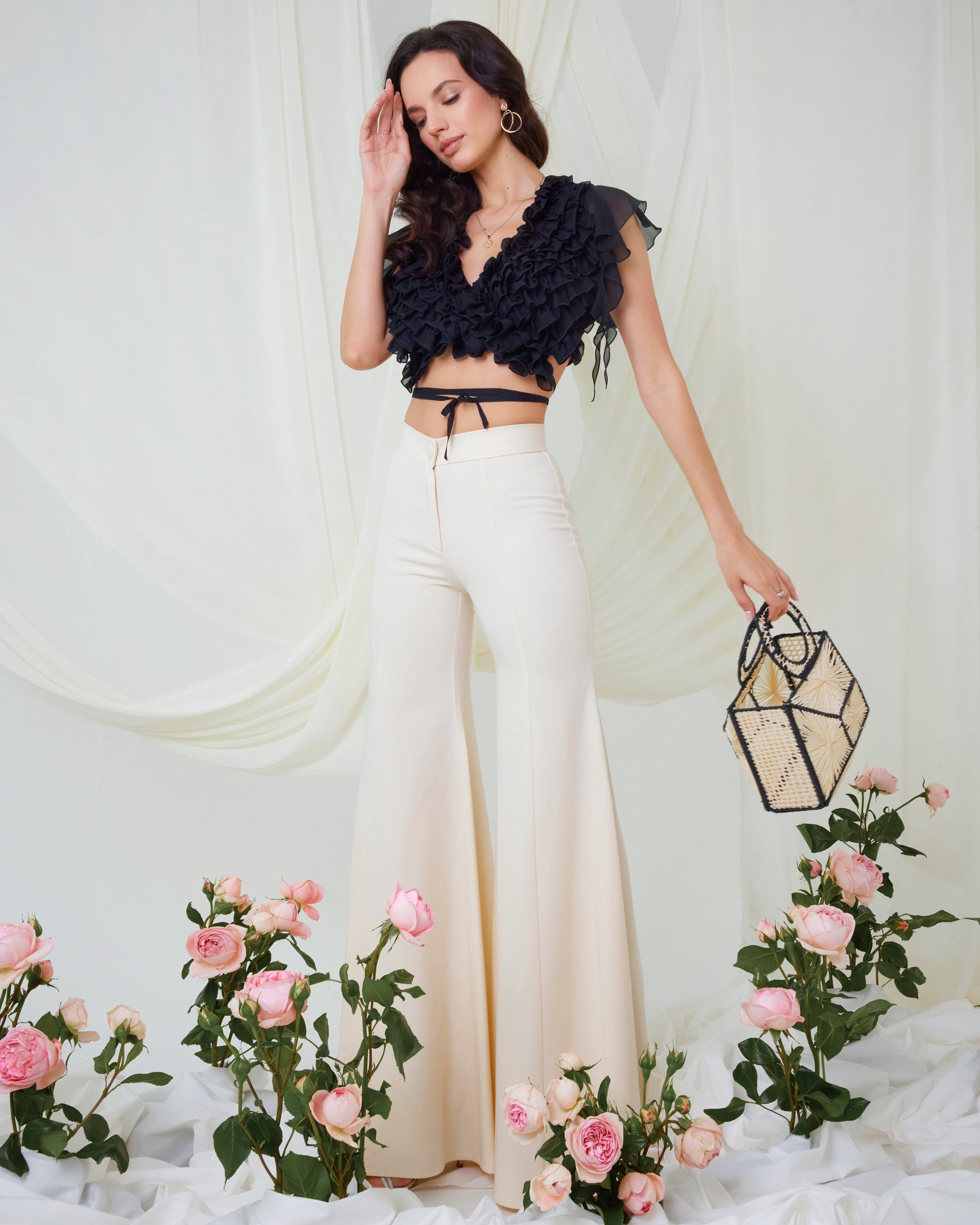 Onyx Crop top design is dark yet romanic. It's cut from the finest black silk chiffon and features cropped silhouette. This top has a glamorous wrap neckline traced with ruffles and fine crossover straps to highlight the waistline. Wear yours with Sophie pants or high-waisted jeans and pumps.