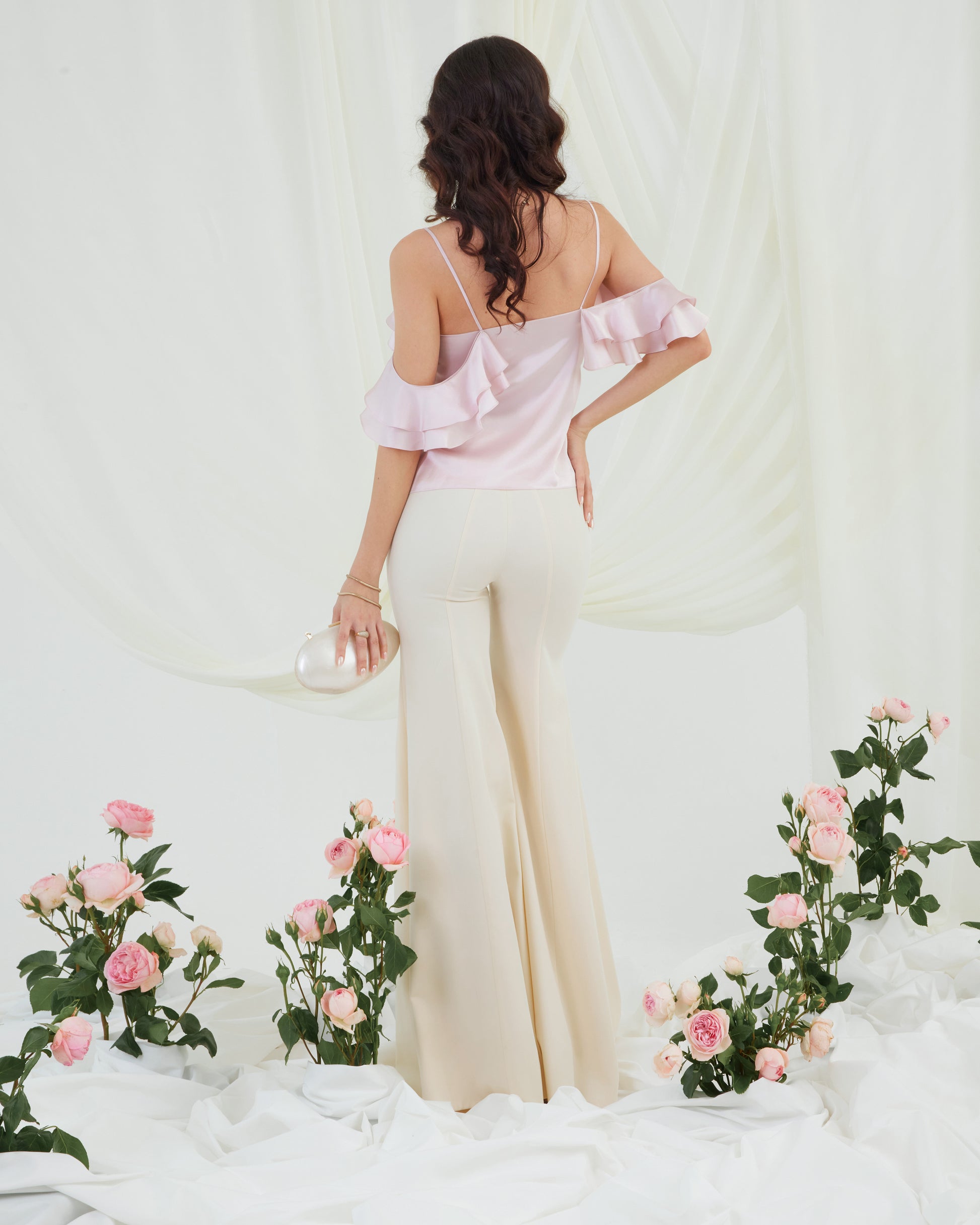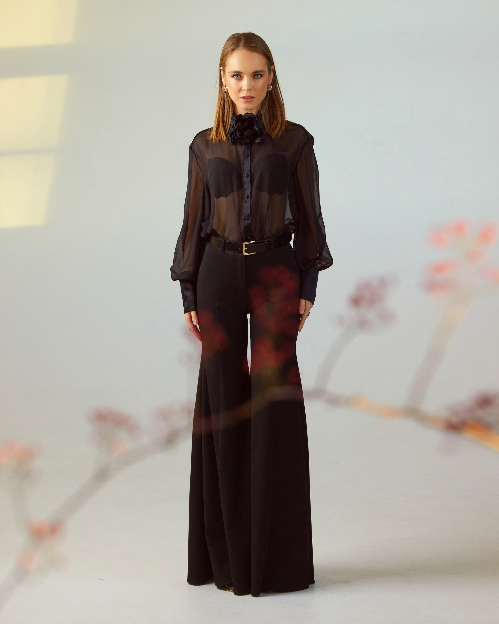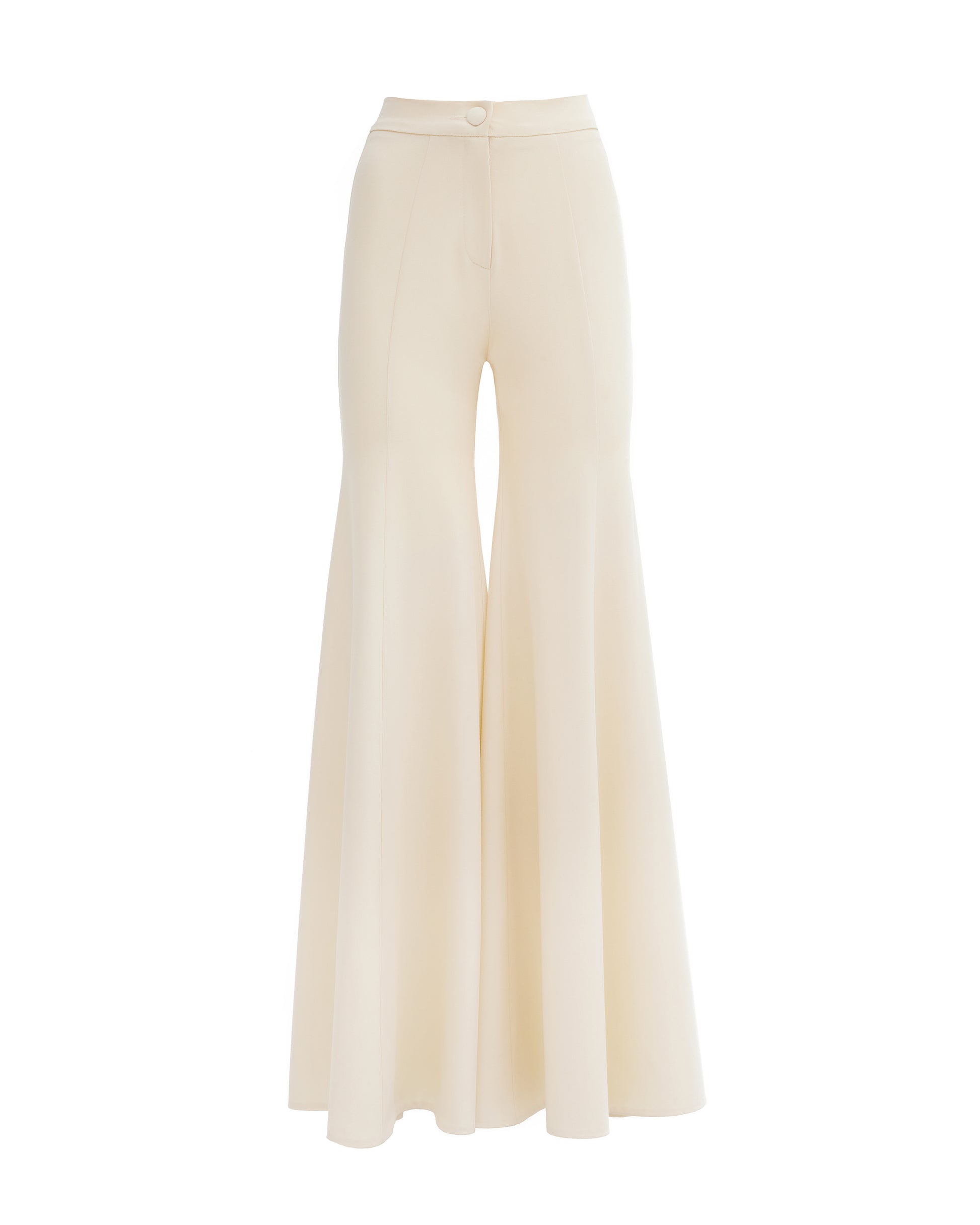 Powerful and elegant, Sophie pants are bringing back the old classic silhouette. Sophie pants are tailored close to the leg before flaring wide above the knee. They're made from stretchy Italian Ivory crepe and sit flatteringly on the waist. The hems are long and exaggerated, so will make anyone who wears them look taller - especially with a great pair of heels.