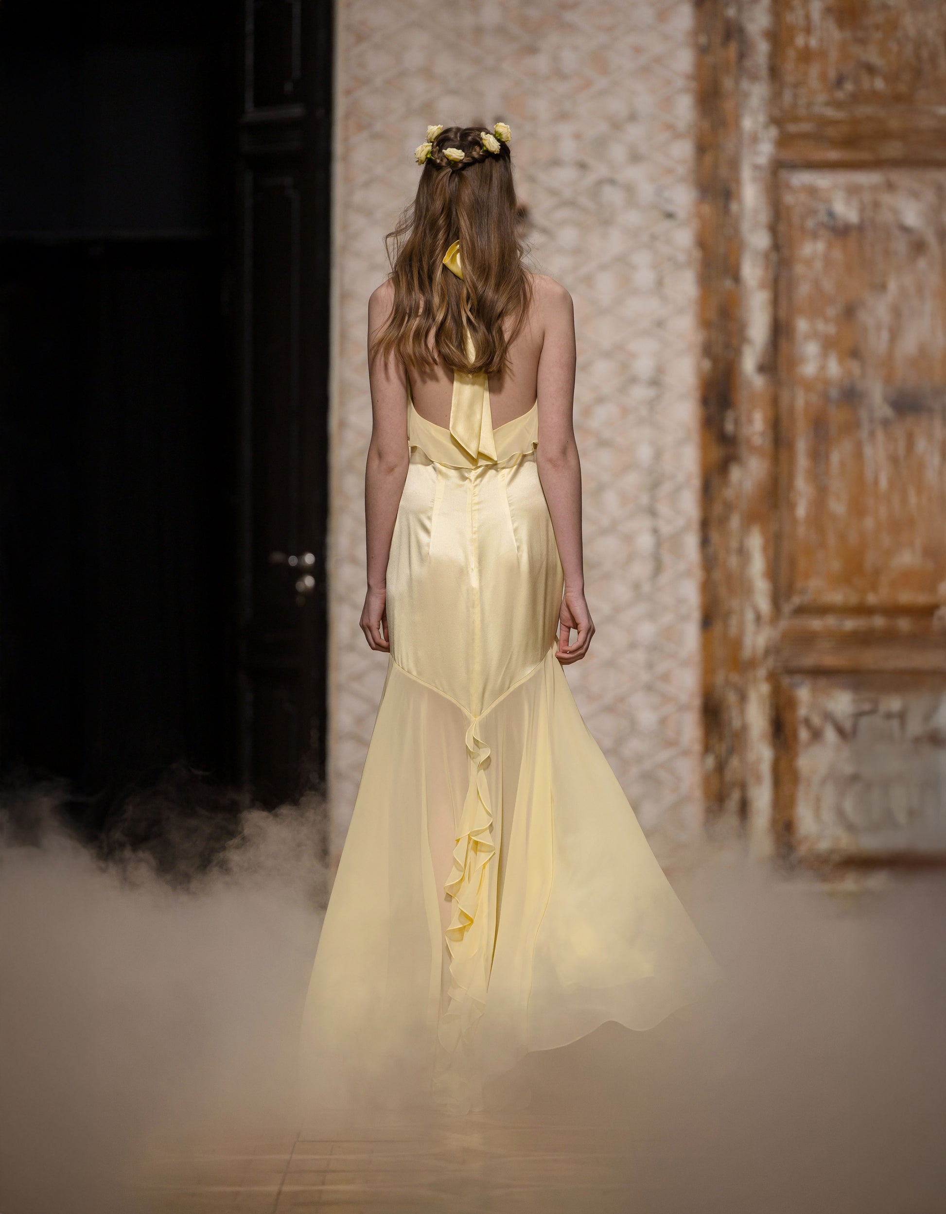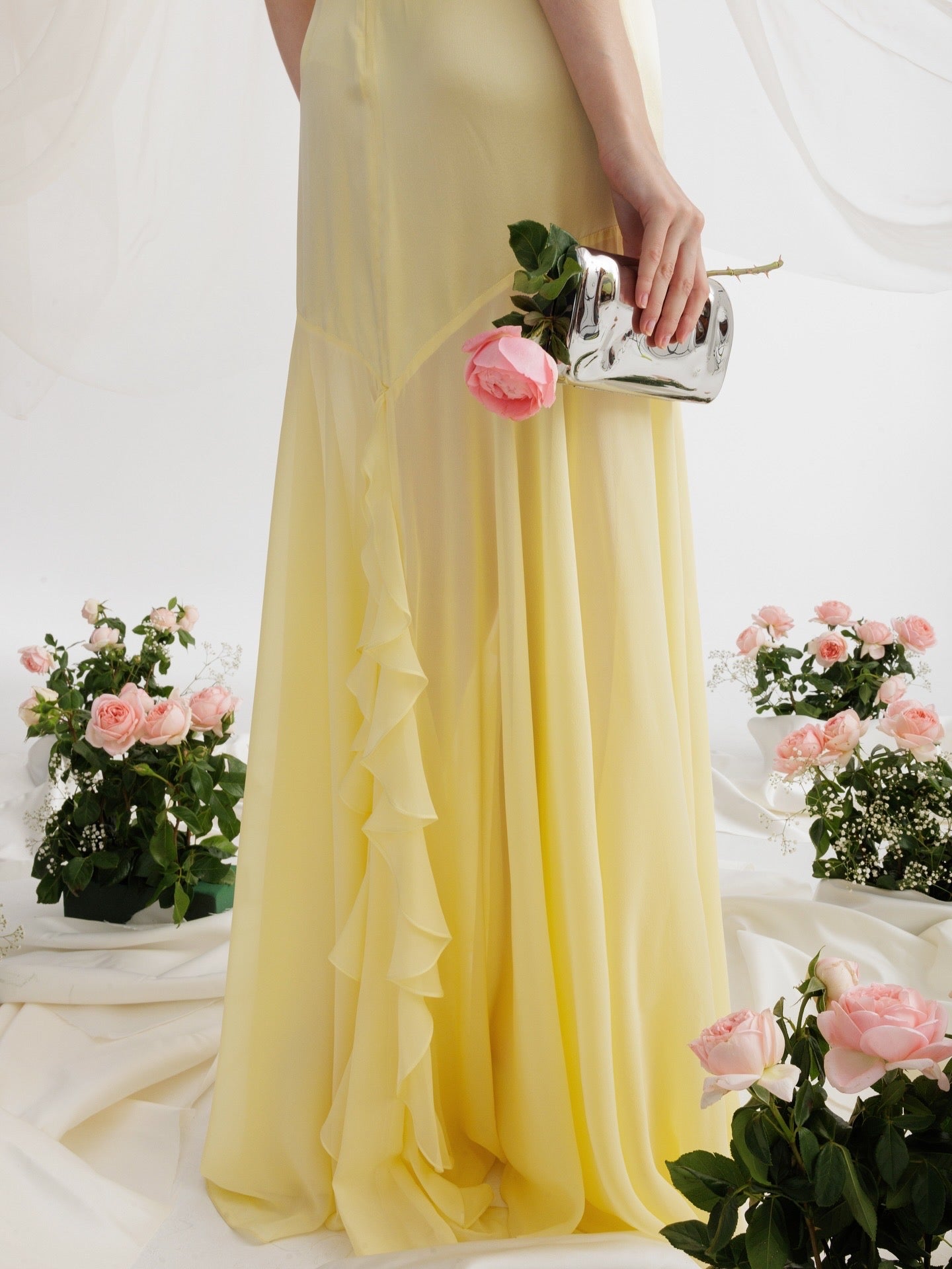 Starlett silk gown is designed to take you wherever your heart desires. Meticulously crafted from soft yellow 100% silk, it evokes the timeless allure of old Hollywood glamour. The halter-neck bodice features a delicate teardrop cutout, adorned with a matching silk rosette. The flowing chiffon skirt, finished with airy ruffles, moves gracefully with every step, like flower petals carried by the wind.